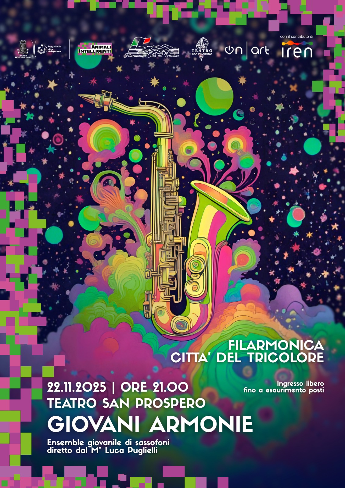 Sabato 22 novembre 2025, alle ore 21:00, il Teatro San Prospero accoglie “Giovani Armonie”, l’ensemble giovanile di sassofoni della Filarmonica Città del Tricolore. Un appuntamento che si inserisce nel programma di “Animali Intelligenti. Nuove produzioni culturali in città“, la rassegna che da ottobre a dicembre attraversa Reggio Emilia con oltre 70 eventi distribuiti tra quartieri, piazze e spazi comunitari.