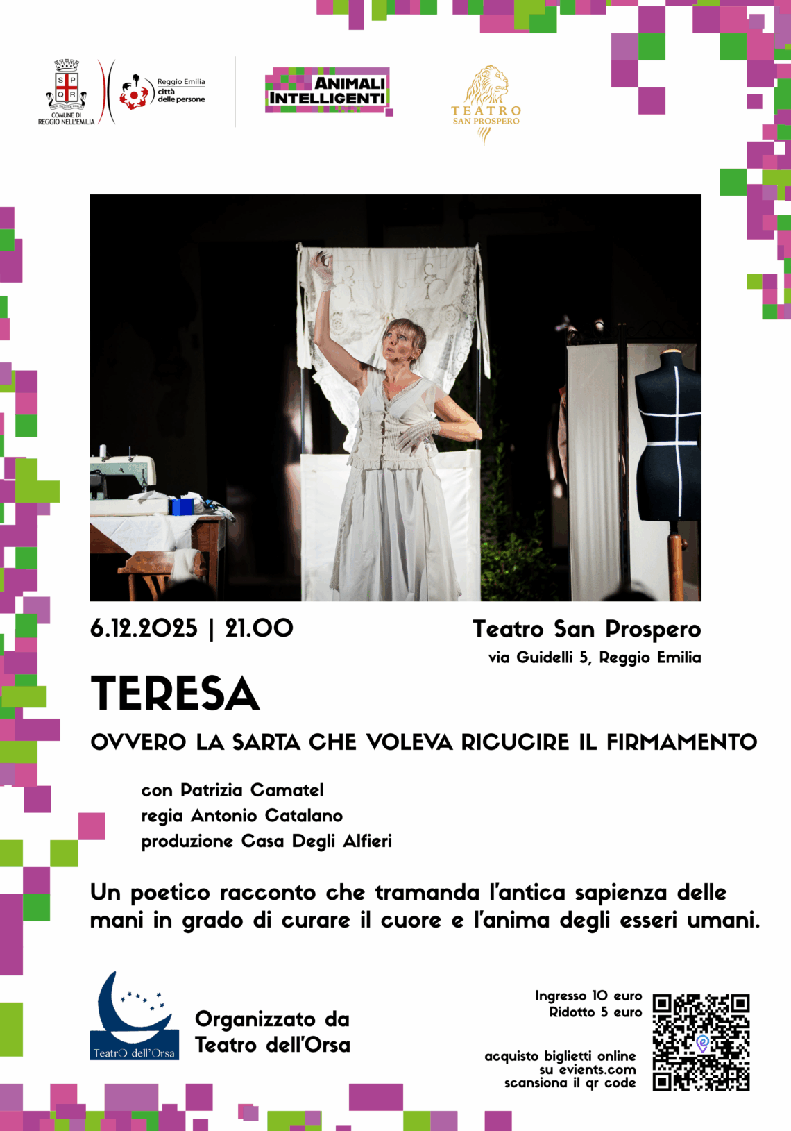 Il 6 dicembre 2025 alle ore 21.00, il palco del Teatro San Prospero si trasformerà in una piccola bottega dell’anima: un luogo in cui ago, filo e ricordi prendono vita grazie a “Teresa – Ovvero la sarta che voleva ricucire il firmamento”, spettacolo tratto dall’omonimo racconto di Antonio Catalano.